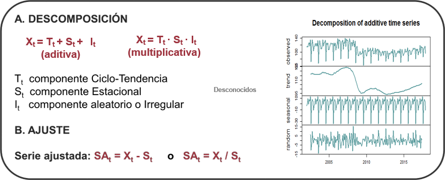 X13: Algoritmo que también modela inicialmente una serie de tiempo con un modelo ARIMA. Luego, extrae los componentes a través de filtros de medias móviles.