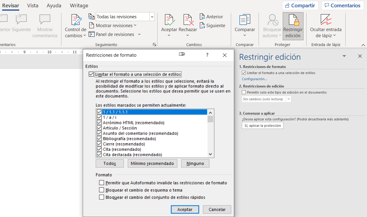 Para bloquear la modificación de formato, hay que hacer clic en Revisar, y dentro de Proteger hacer clic en Restringir edición. Se abrirá una ventana en el lado izquierda, en el que se puede eligir distintas restricciones de edición. Por ahora, solo nos interesarían las Restricciones de formato y su configuración.