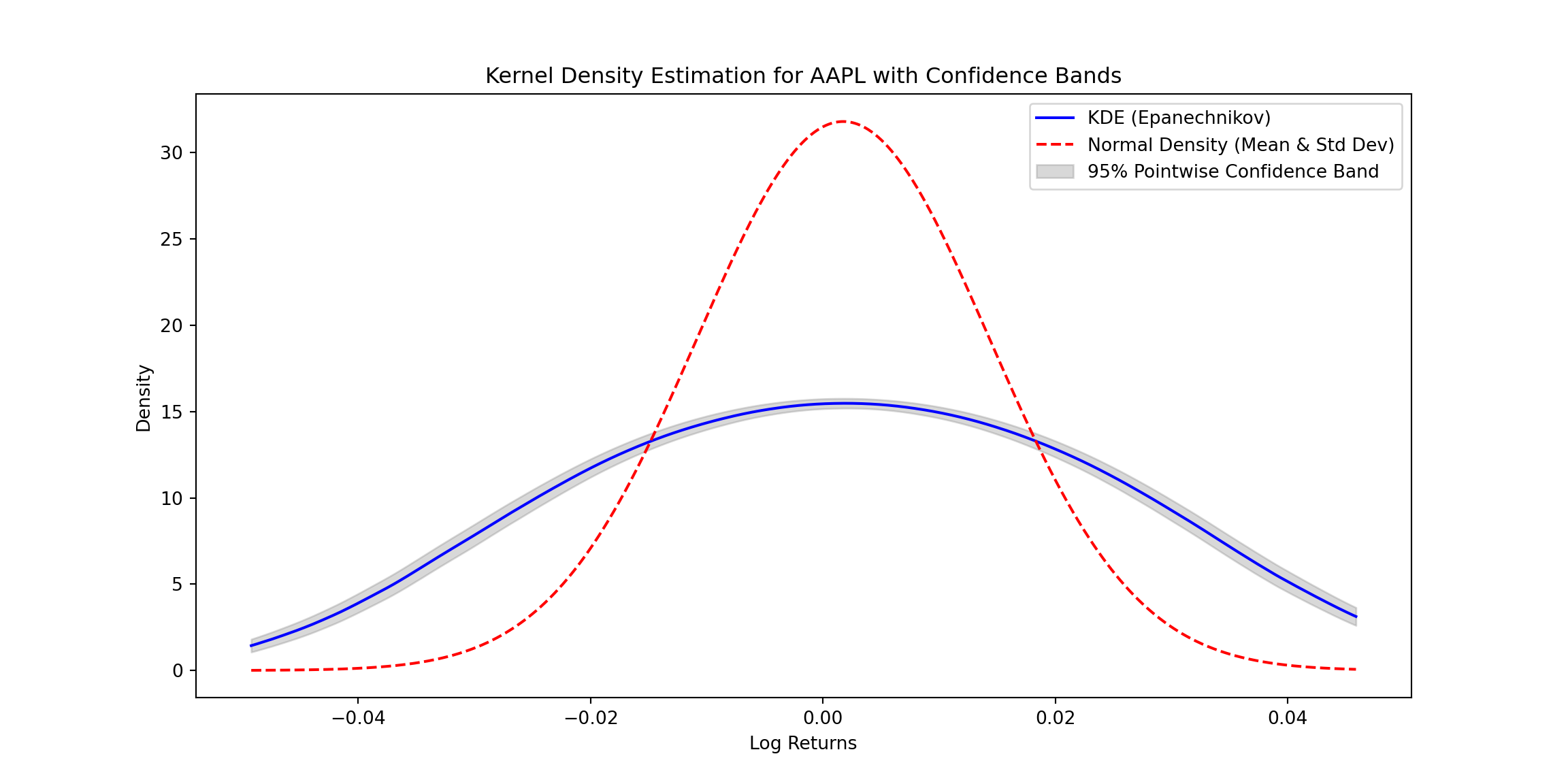 Here’s a KDE estimator example with pointwise confidence bands for financial data using the Epanechnikov kernel. The code downloads stock price data (APPLE), computes log returns, and estimates the density with confidence bands. The normal density is also calculated for comparison. :