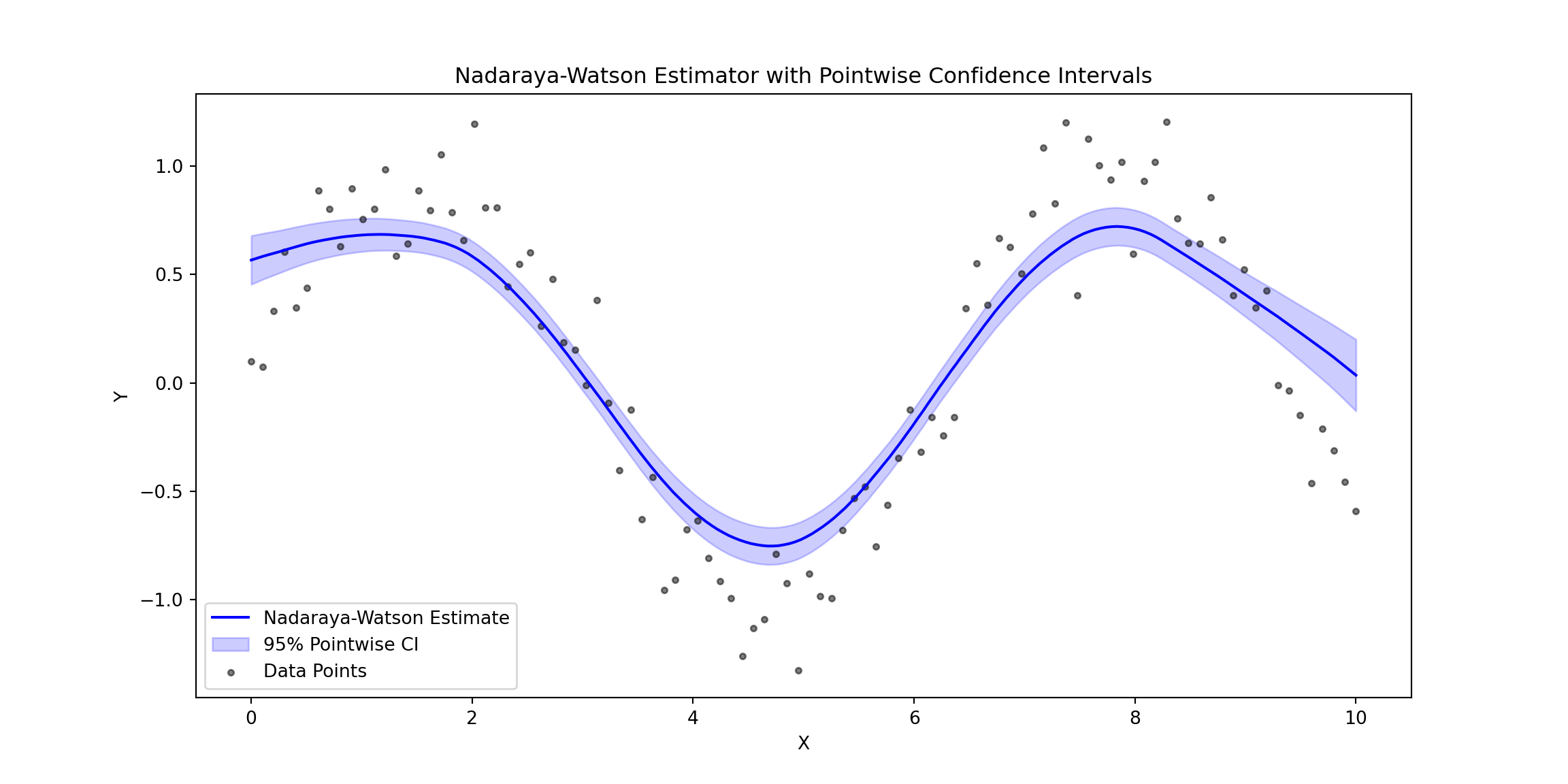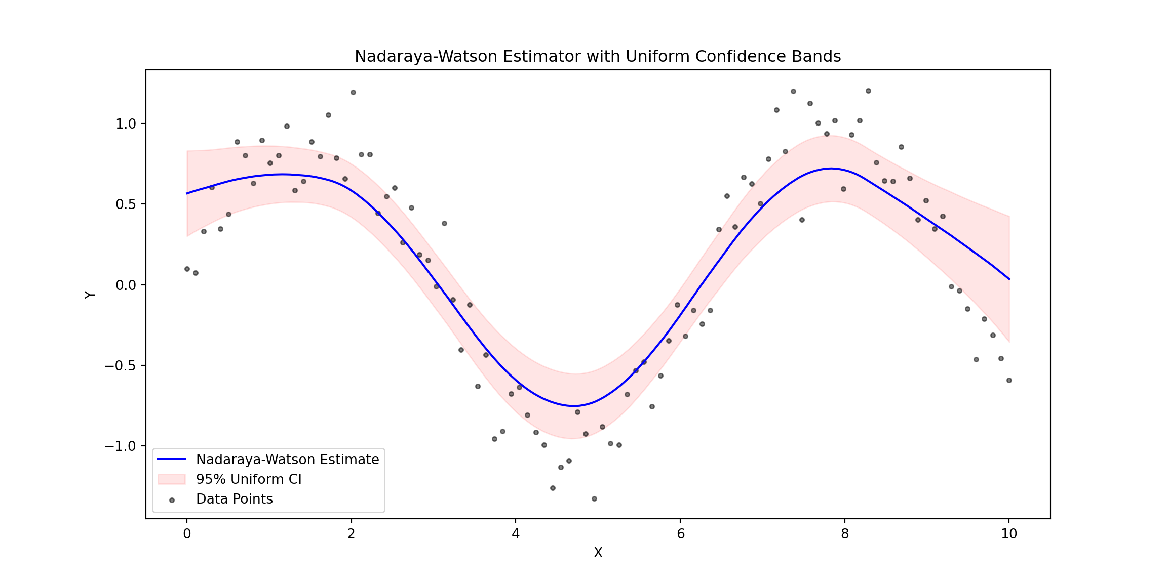 In this post, we explored the theory and implementation of Kernel Density Estimation (KDE), the Nadaraya-Watson Estimator, and the Local Linear Estimator, along with methods to construct 95% confidence bands (pointwise and uniform). These non-parametric techniques provide a flexible framework for analyzing data without assuming a specific parametric model, making them powerful tools for understanding complex relationships.
