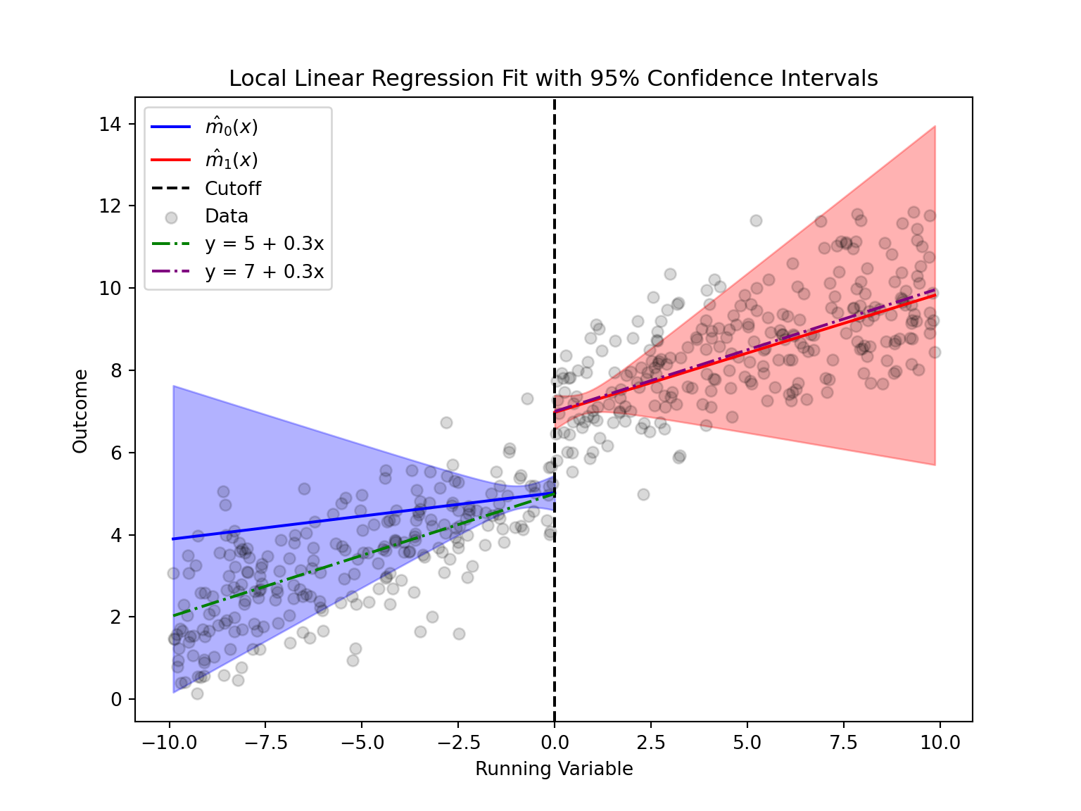 As we can see, the local linear regression effectively emphasizes the data closest to the cutoff by using weighted observations. While the slope estimates may be more variable—since they rely on data closer to the cutoff, the intercept provides a robust estimate of the treatment effect at the cutoff. This is why the confidence interval is narrow near the cutoff (where the model is most precise) and widens as we move away, reflecting that our inference is primarily focused on the discontinuity point. Overall, the model accurately captures the differences in outcomes between the two sides of the cutoff.